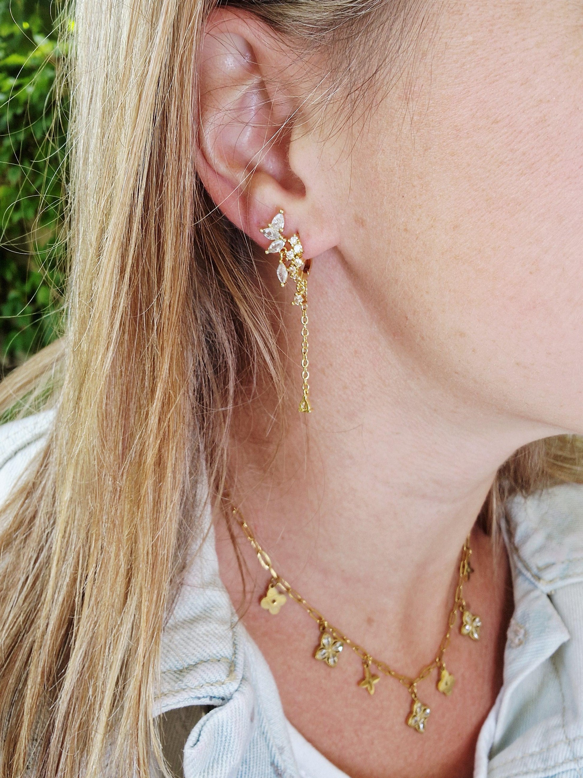 Pierres : Zircons transparents facettés Style : Créoles avec chaîne pendante Couleur : Doré et cristal