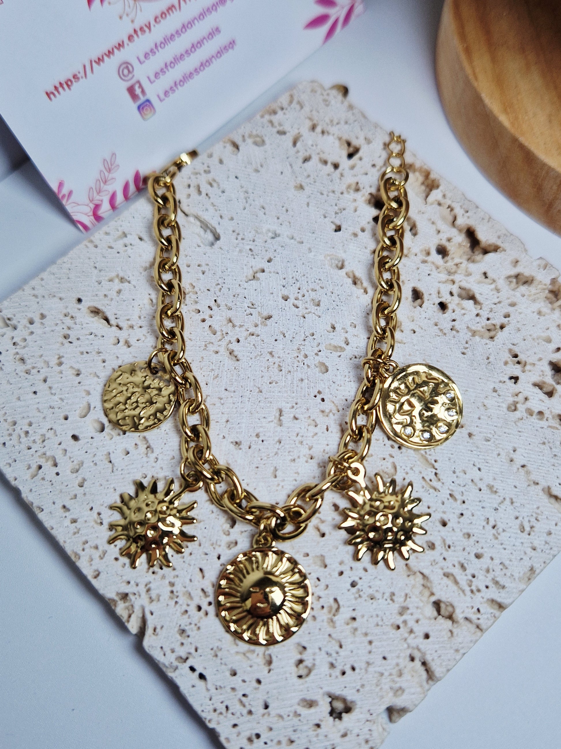 Sa chaîne épaisse met en valeur de superbes charmes martelés et solaires, pour un look à la fois chic et bohème.