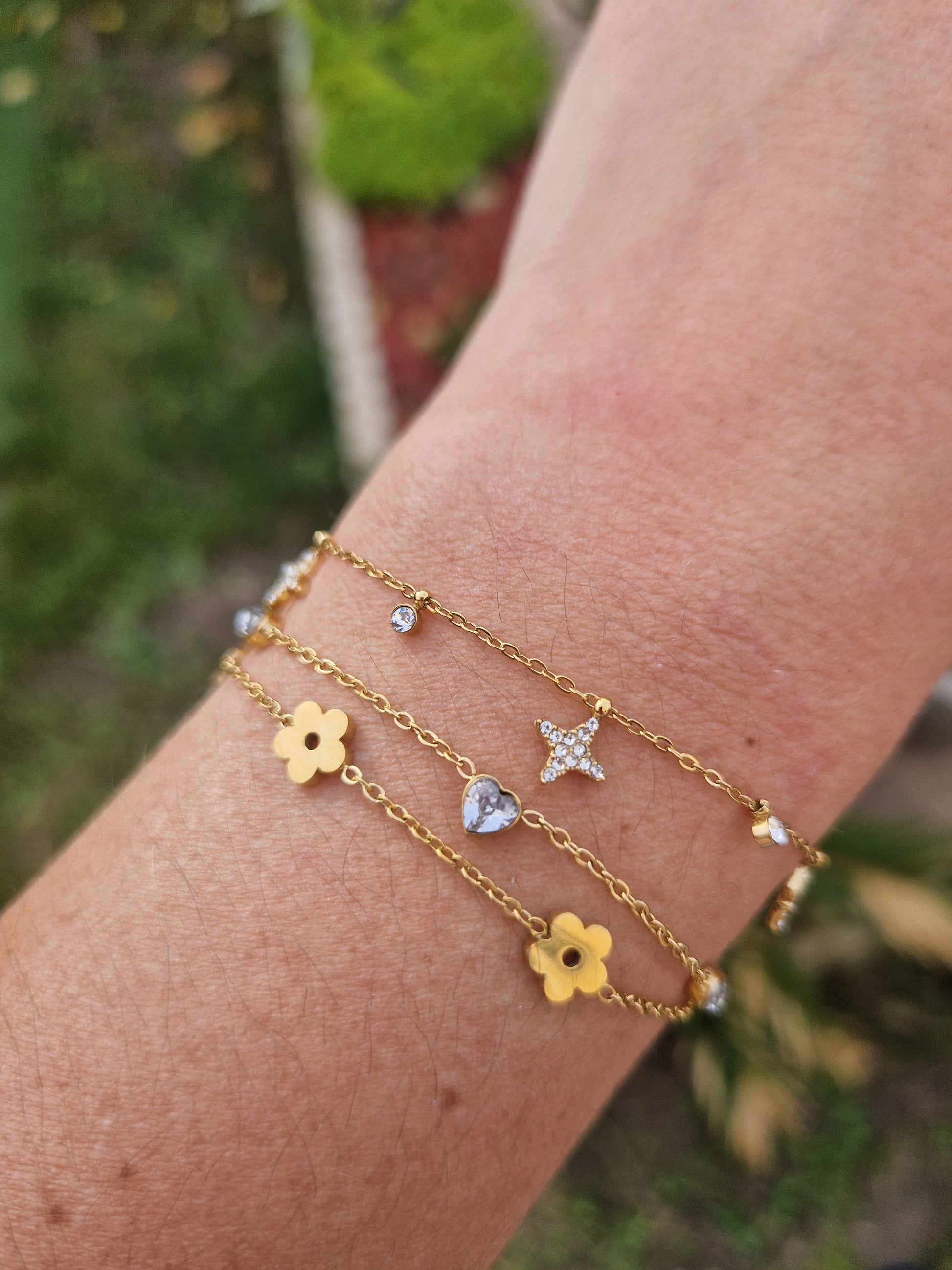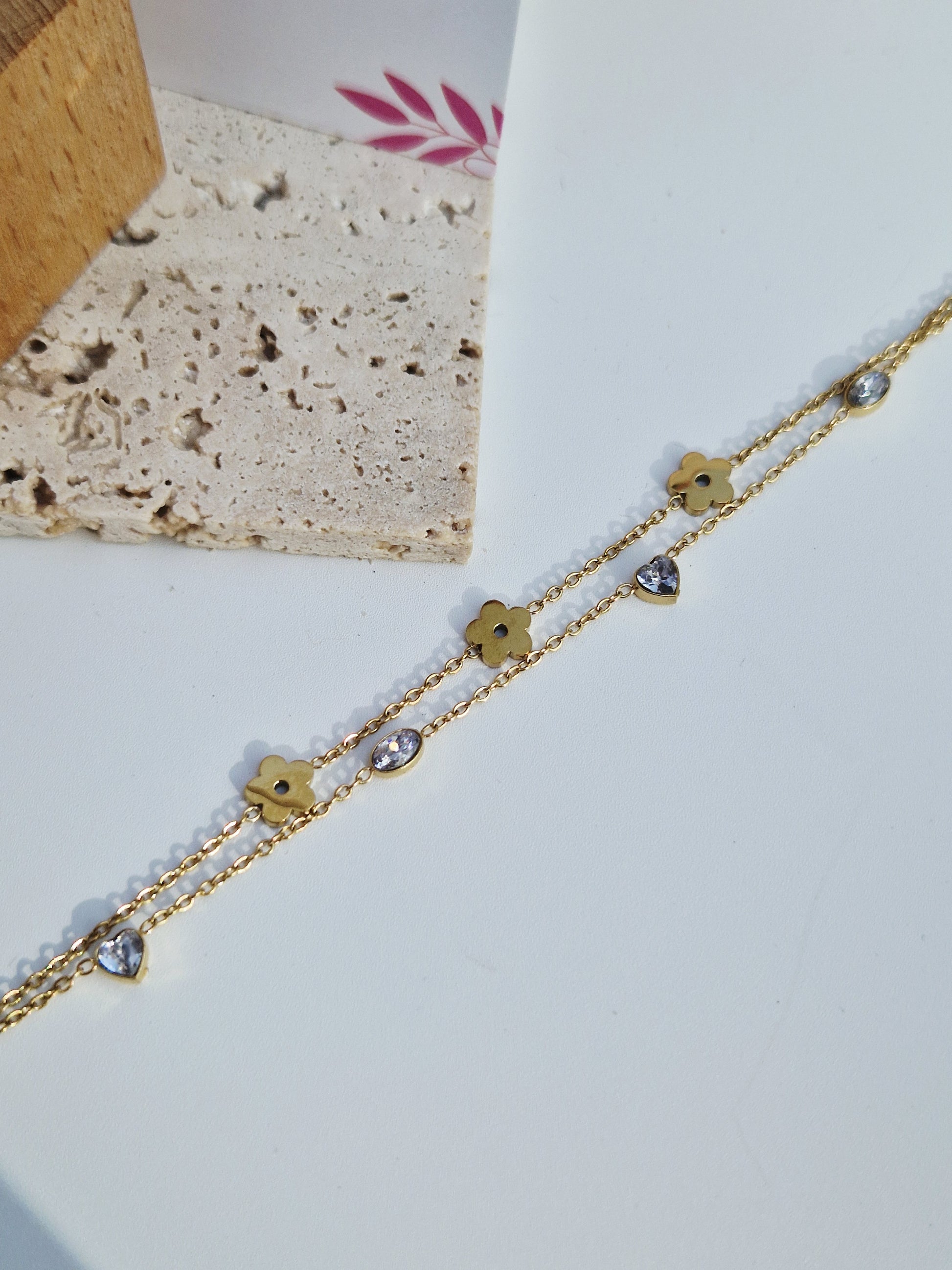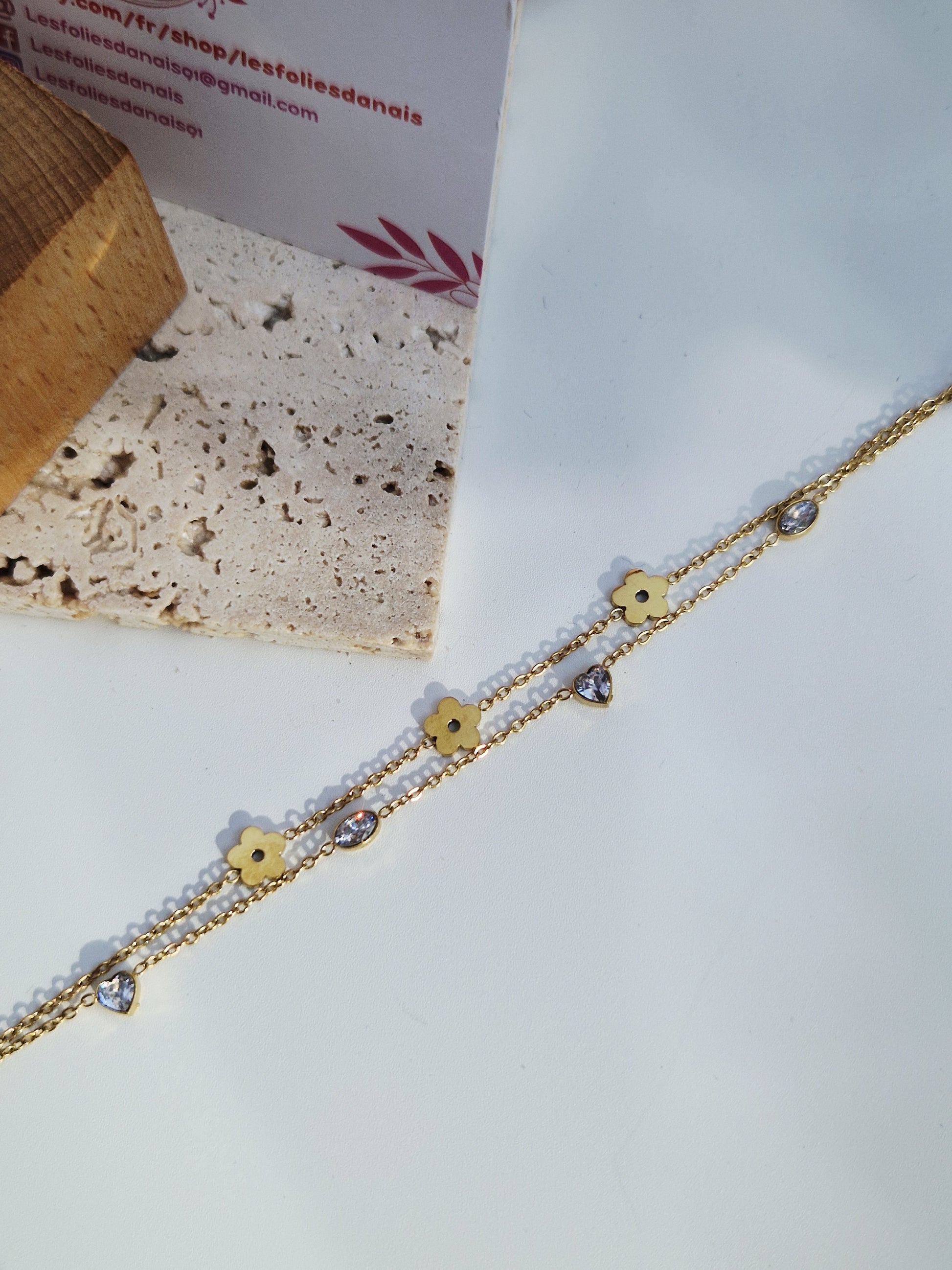 Sa double chaîne dorée en acier inoxydable est ornée de petites fleurs ajourées et de pierres scintillantes, pour un rendu élégant et lumineux.