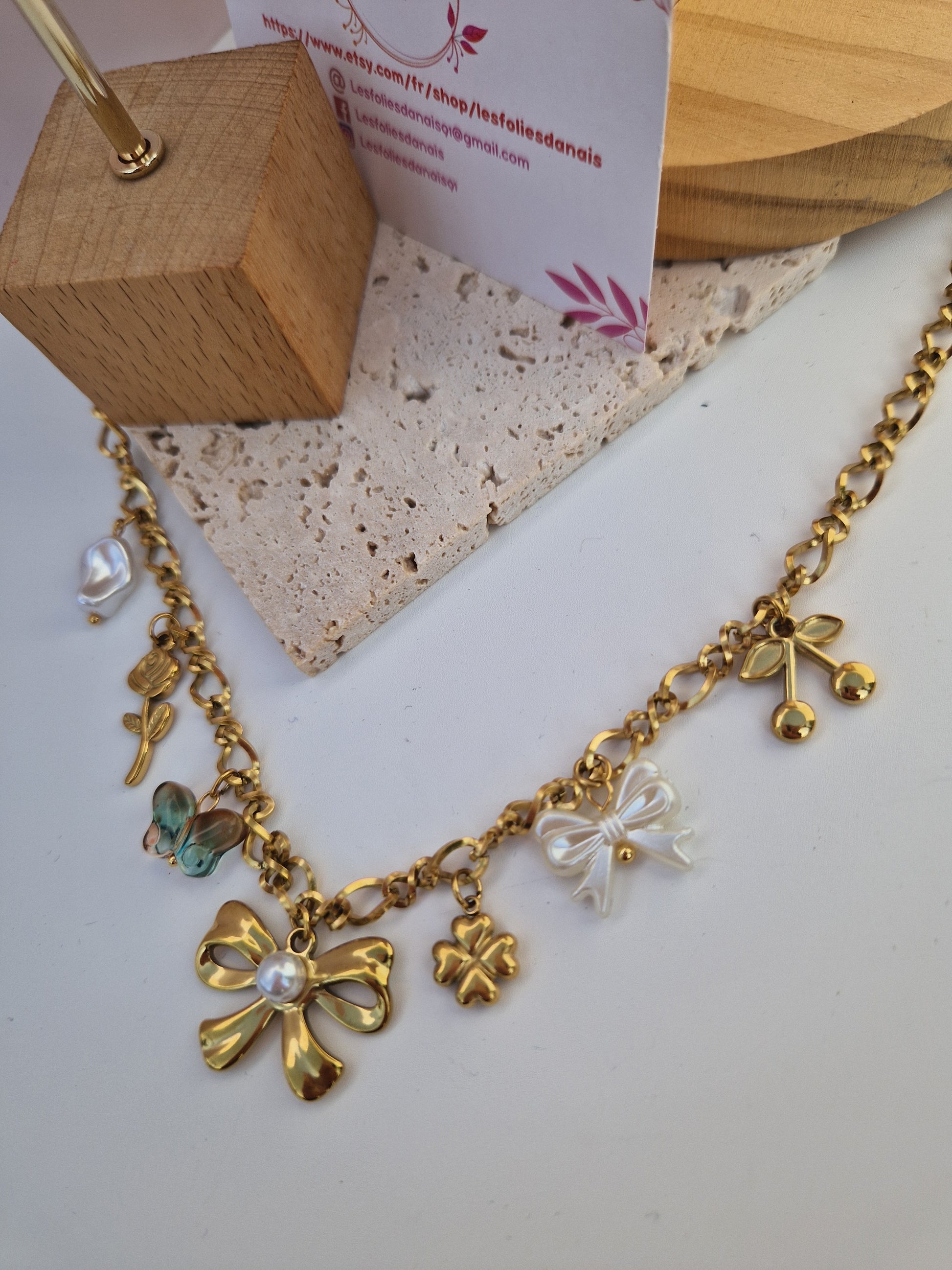 Composé de charms dorés délicats — nœud, papillon, fleur, trèfle et perle nacrée — il illumine votre cou avec élégance.