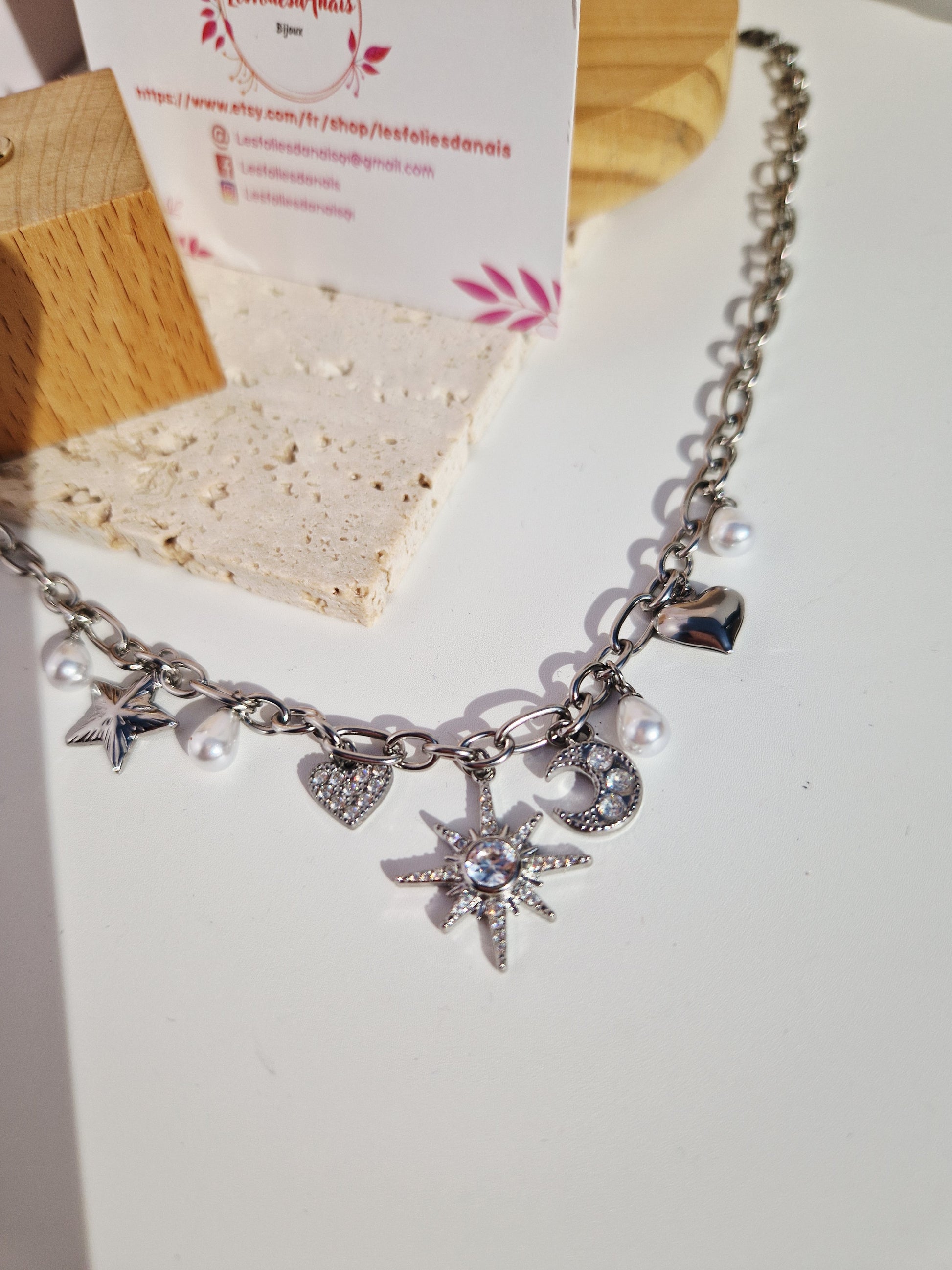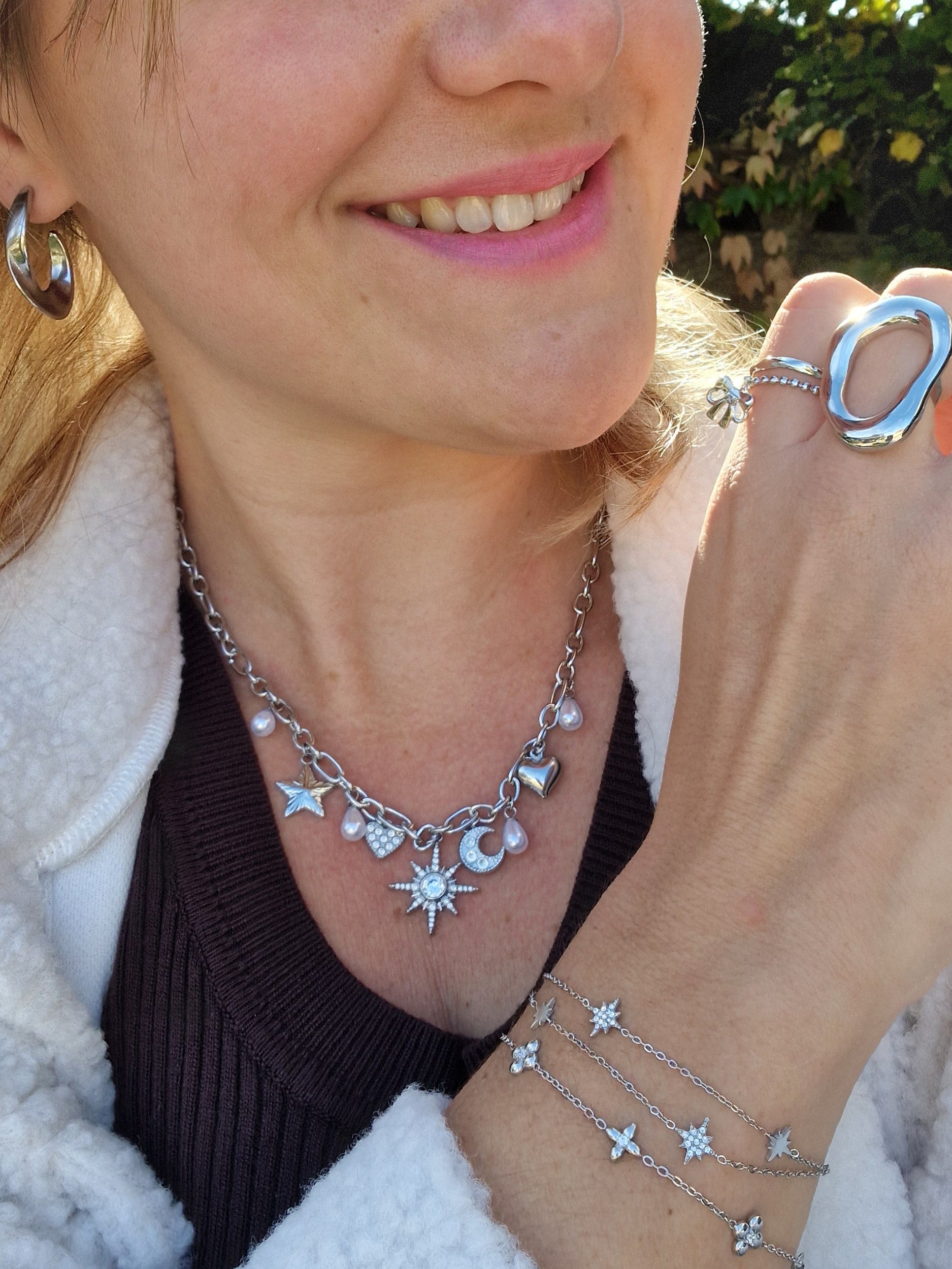 Ses charms délicats — étoile, lune, soleil, cœur et perles nacrées — apportent une touche de lumière et d’élégance à votre tenue.