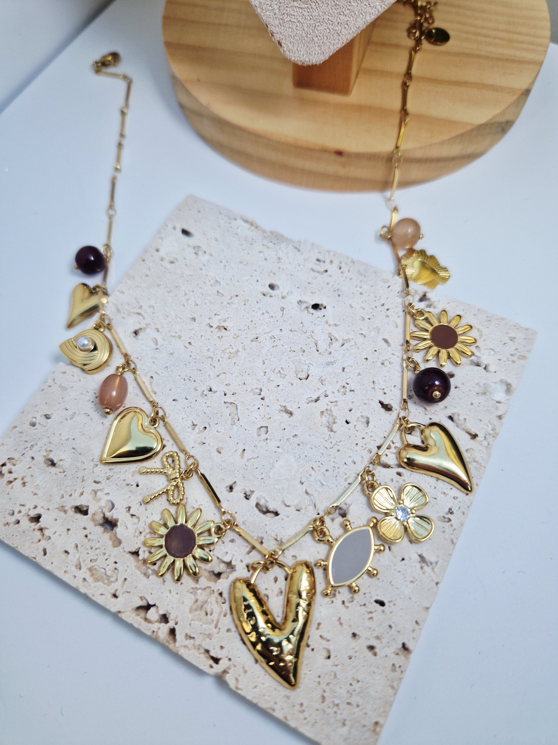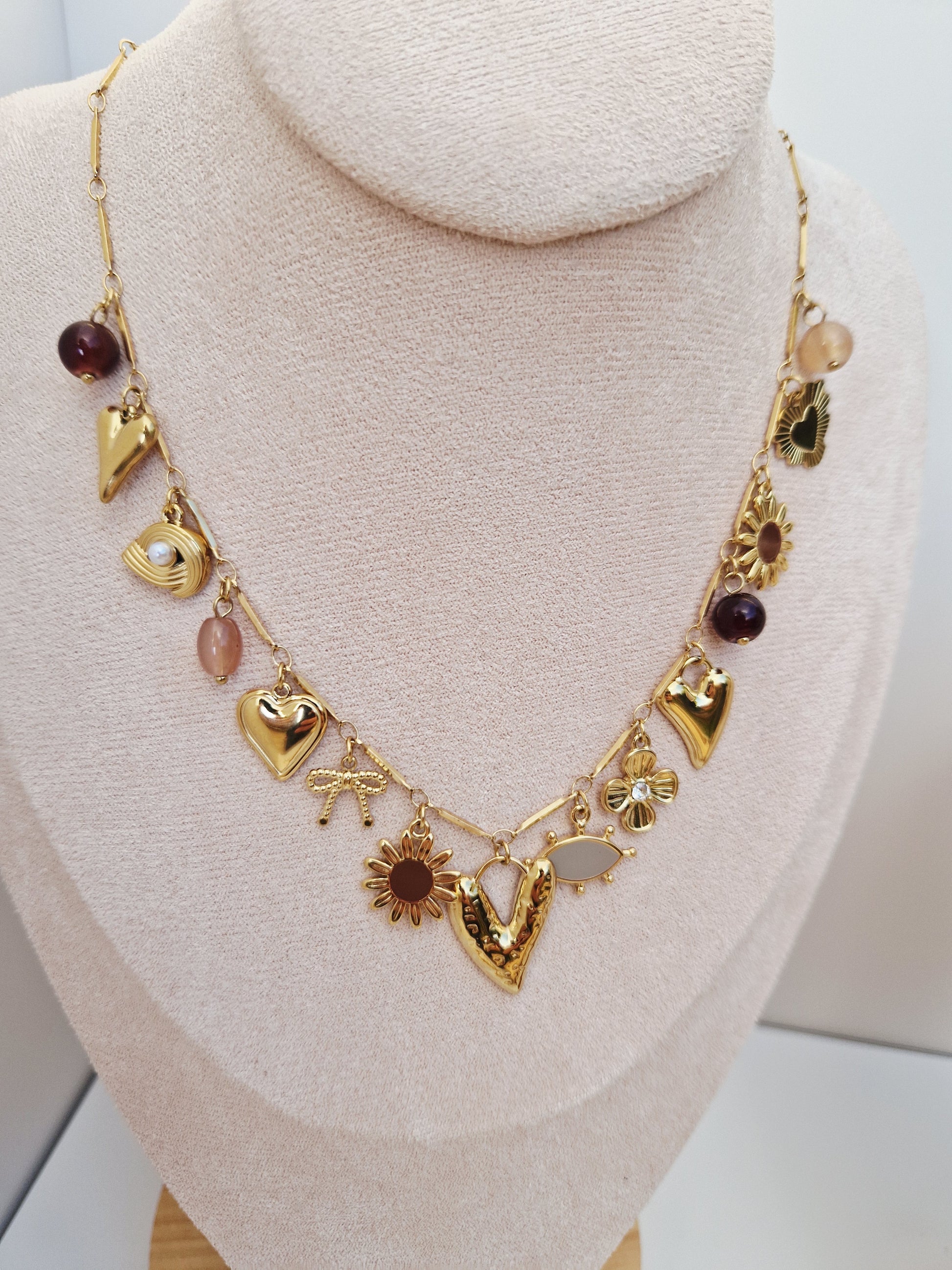 Orné de charms dorés — cœurs, fleurs, nœud et médaillons nacrés — il évoque un jardin lumineux et délicat.