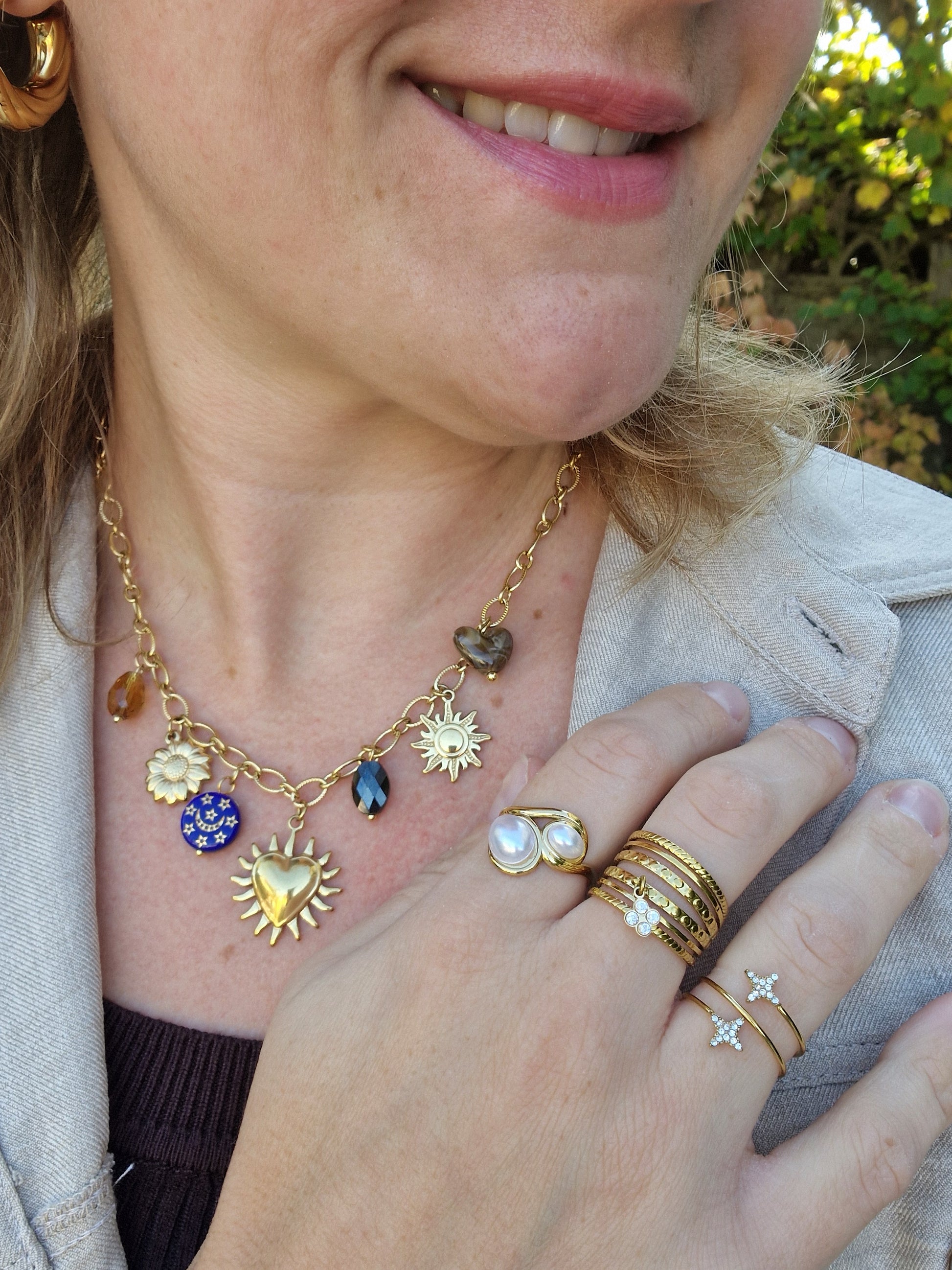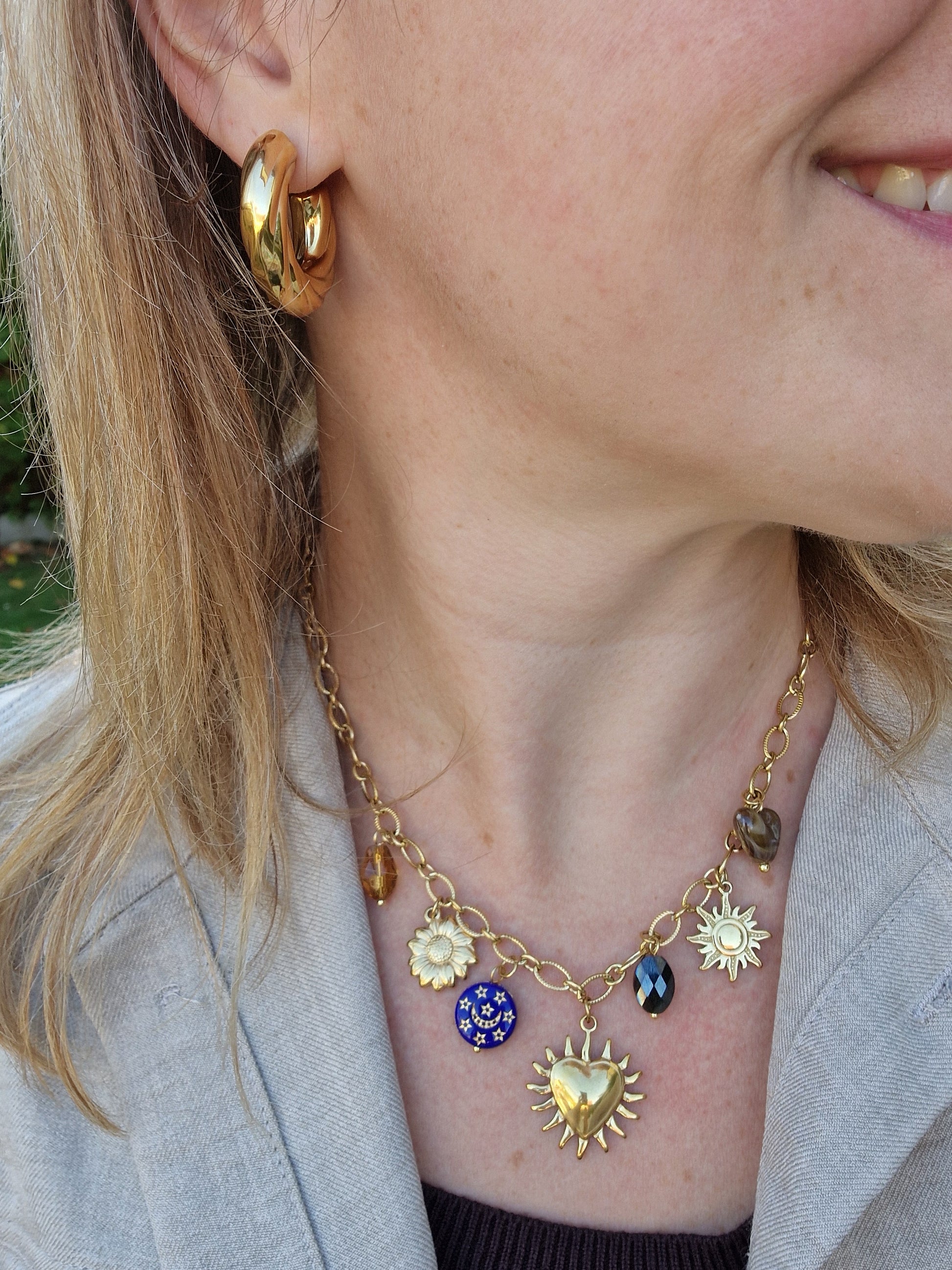 Orné de charms dorés symbolisant le soleil, la lune et les étoiles, il mêle reflets dorés et touches de bleu profond pour une allure à la fois élégante et mystique.