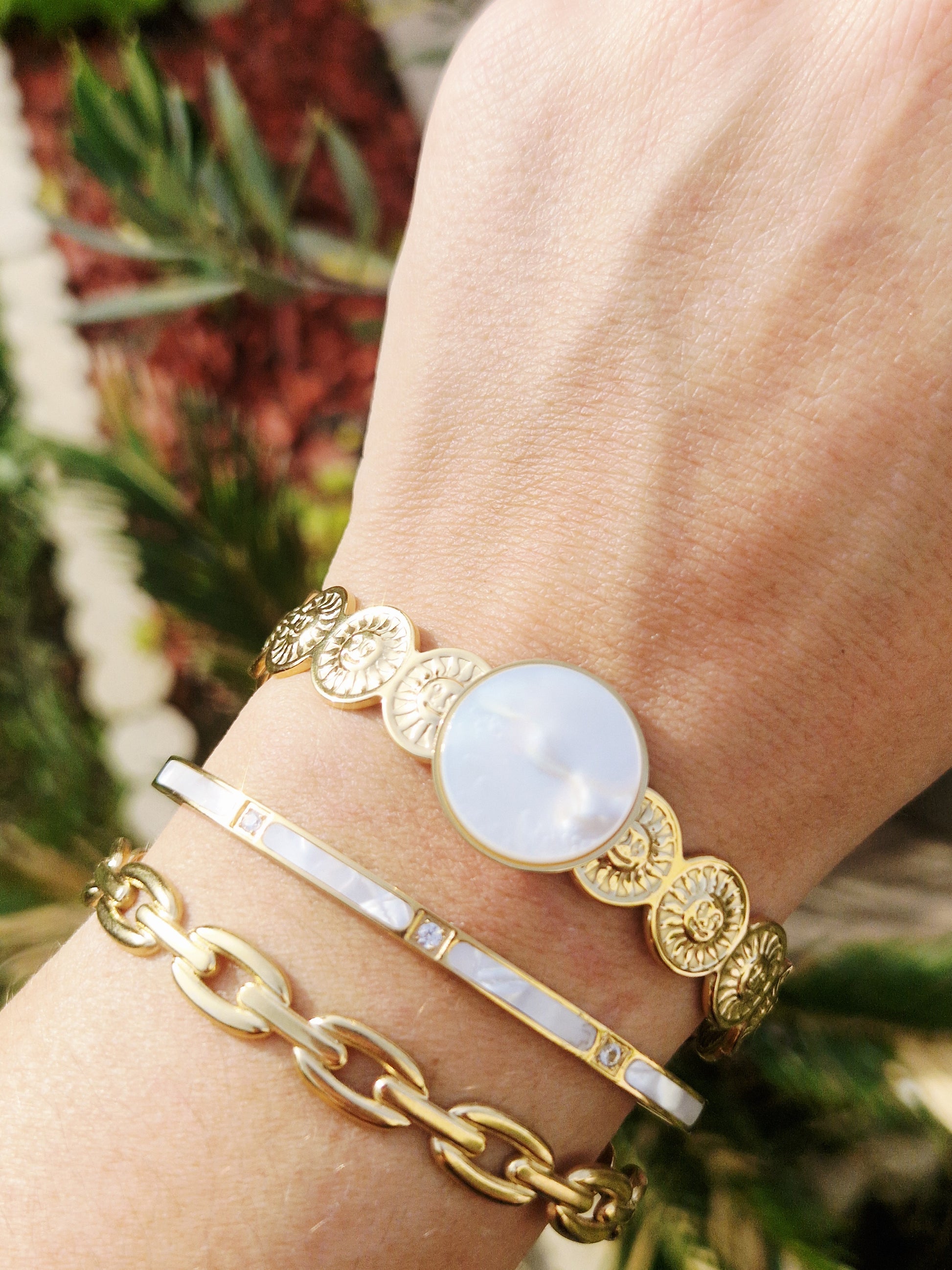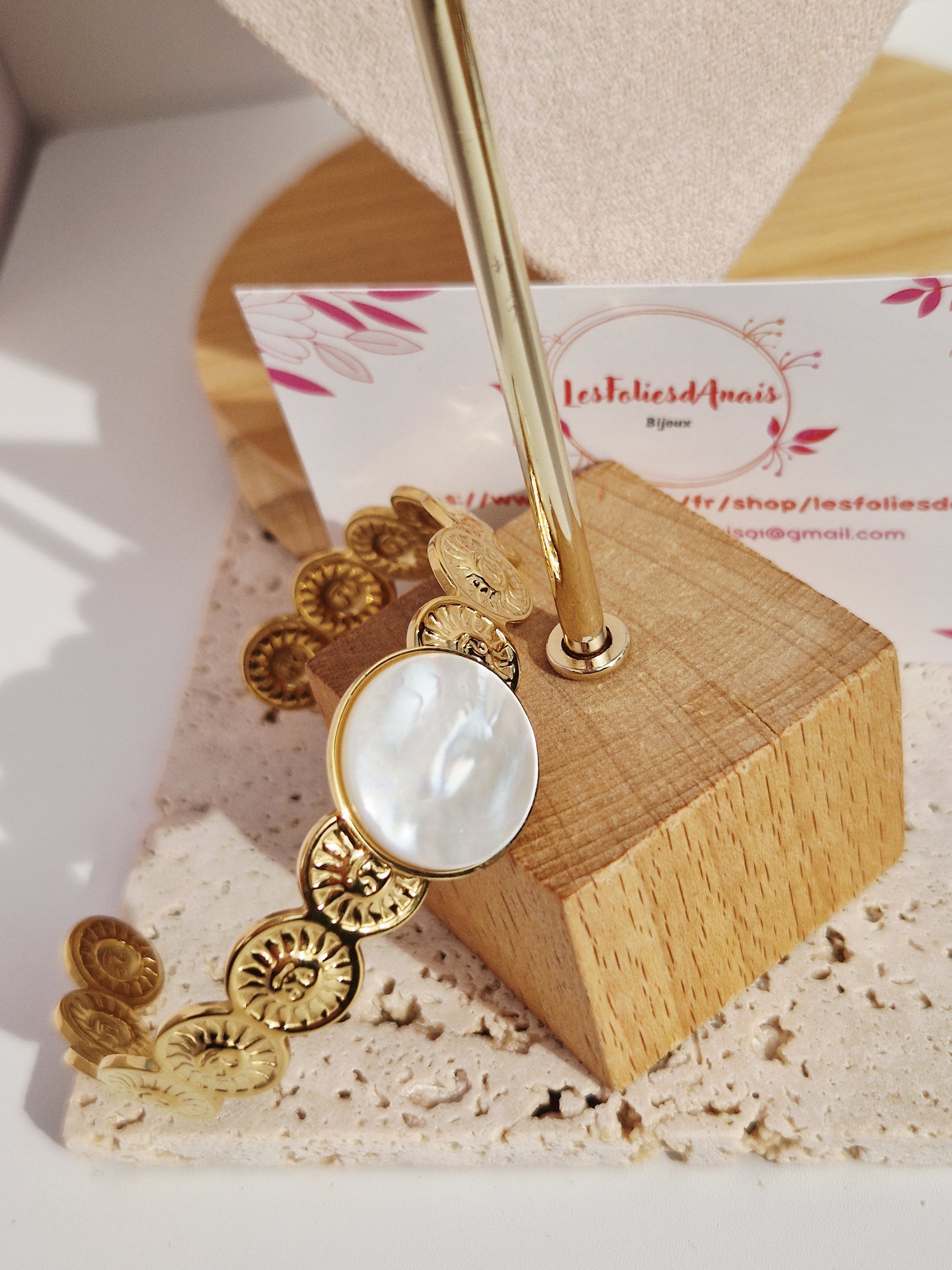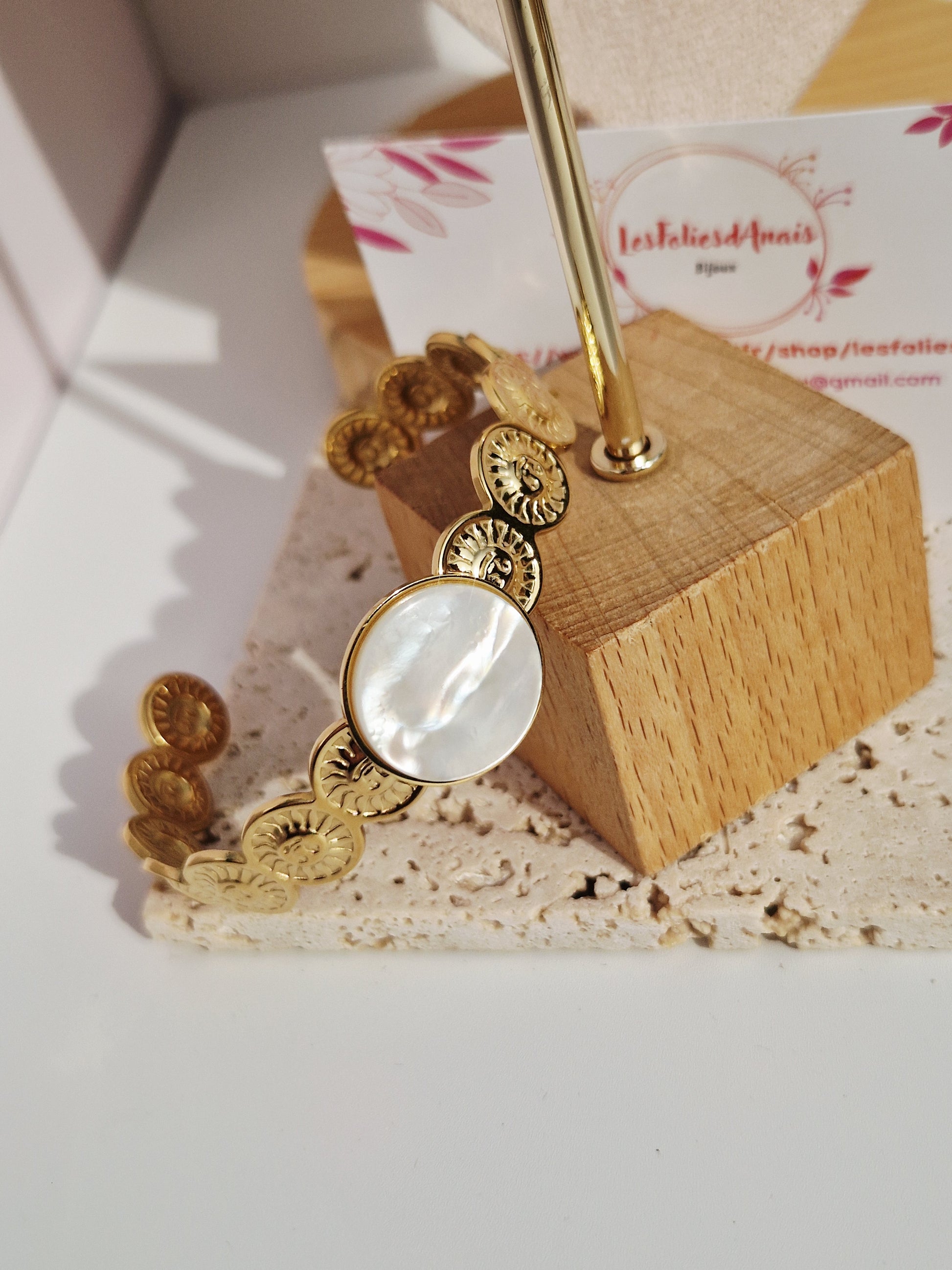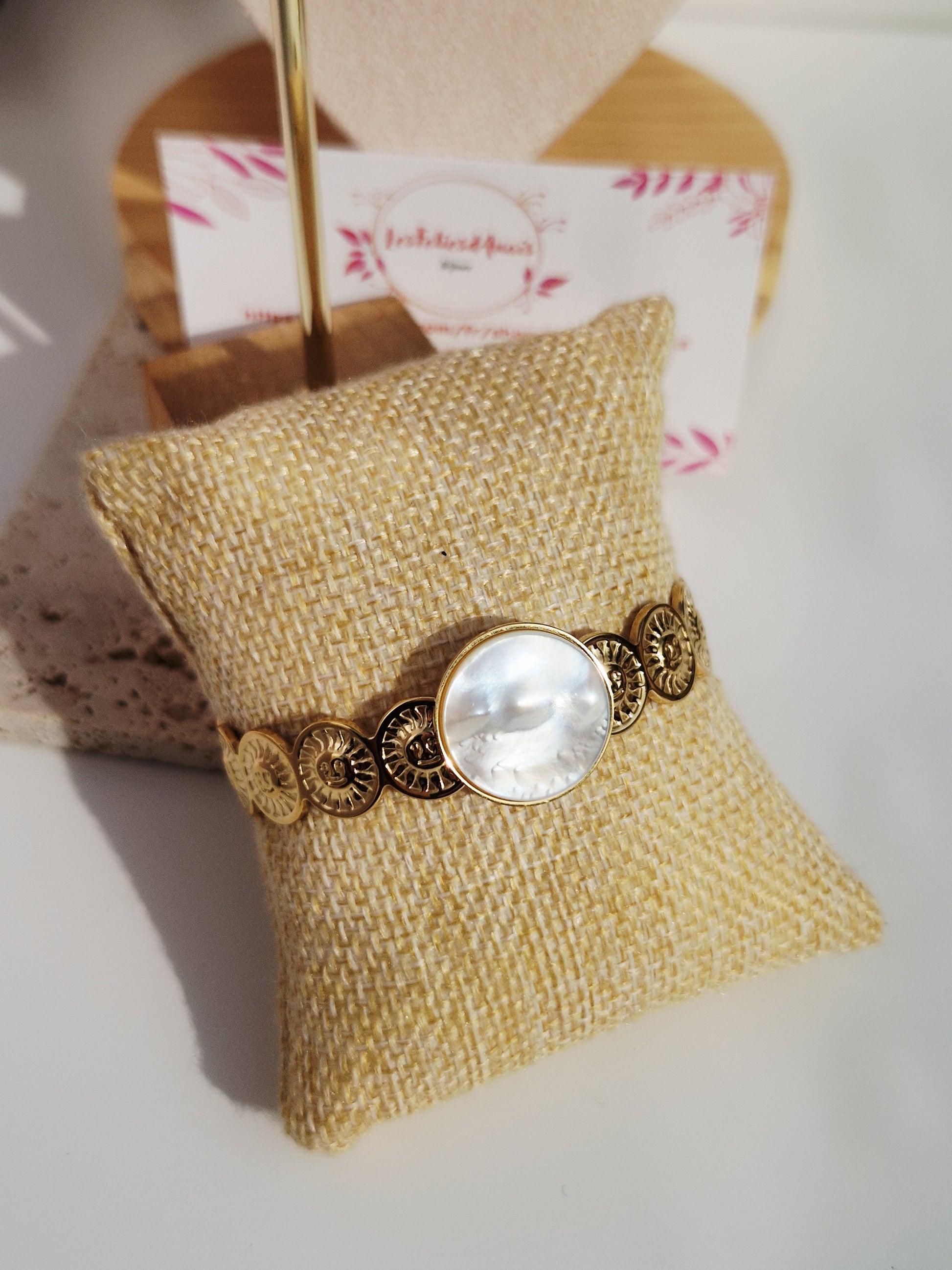 Son médaillon en nacre naturelle capte la lumière à chaque mouvement, tandis que ses motifs dorés délicatement gravés apportent une touche solaire et féminine.