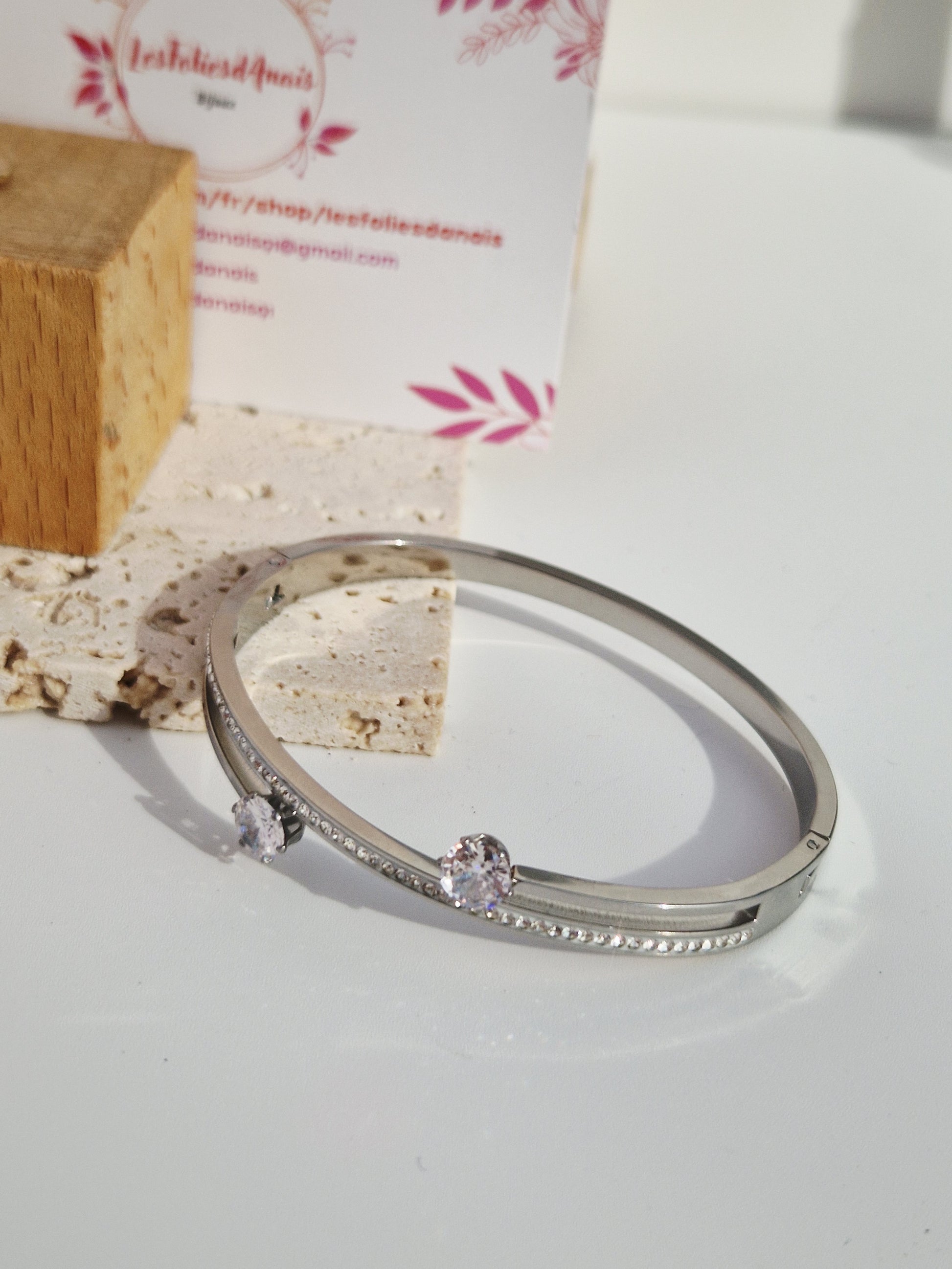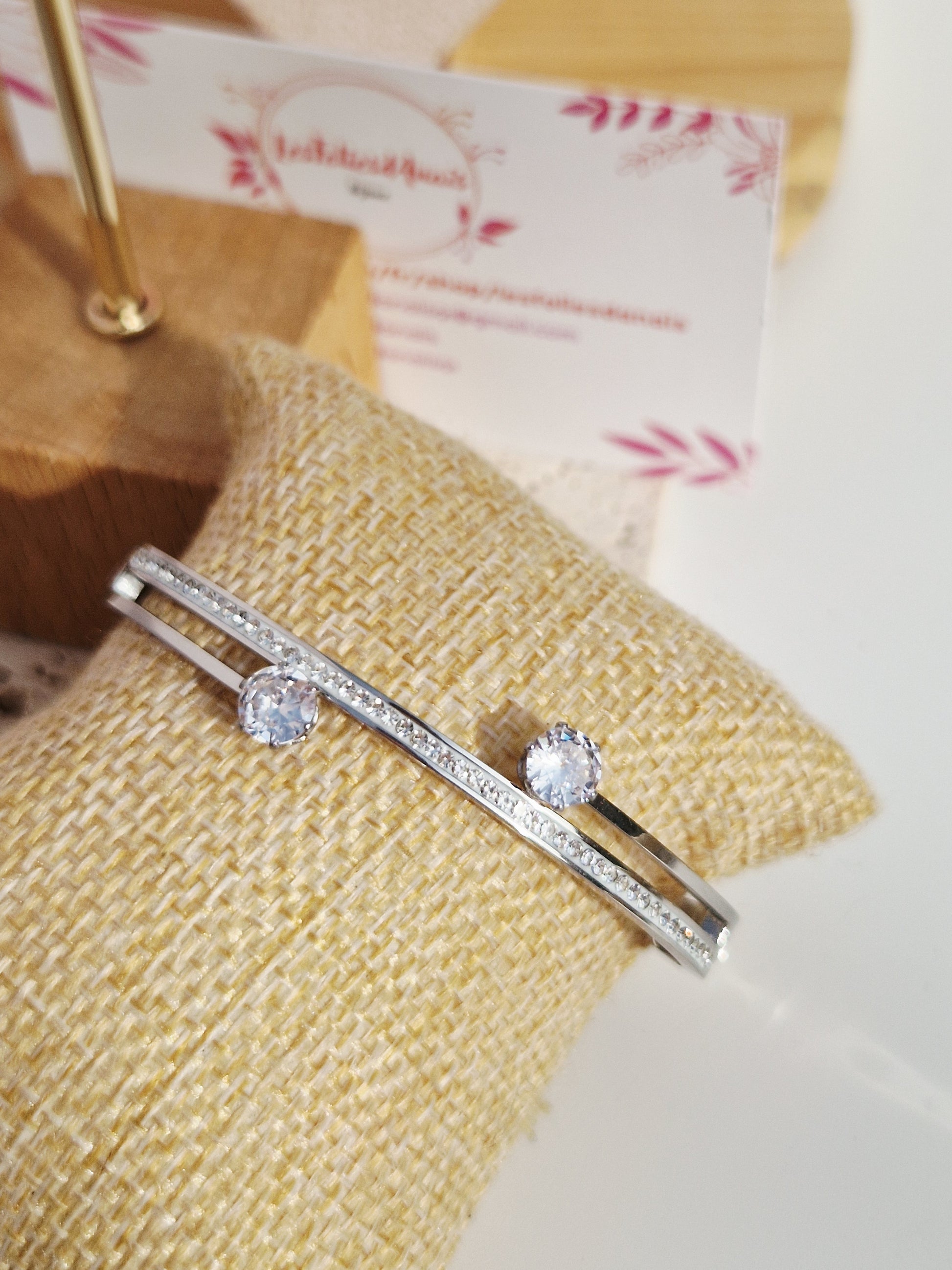 Sa forme ouverte ornée de deux pierres scintillantes et sa ligne de strass délicatement incrustée en font un bijou lumineux et chic.