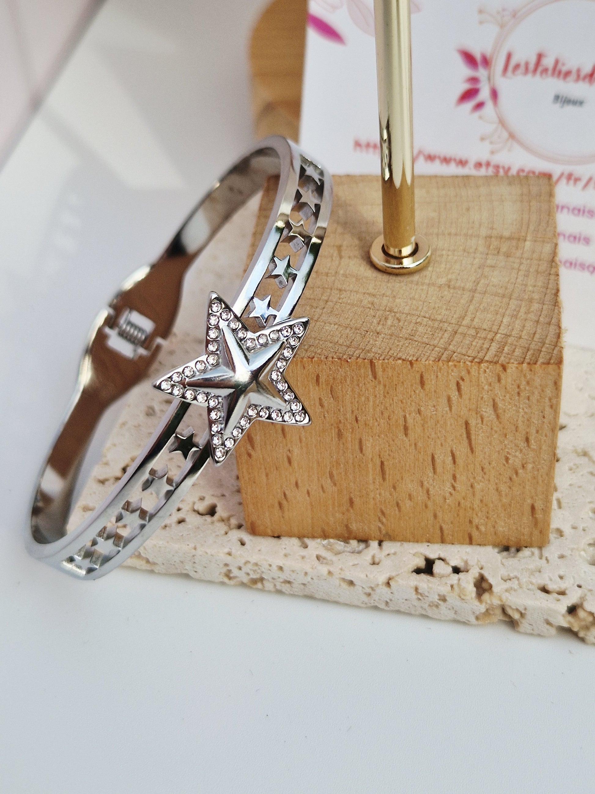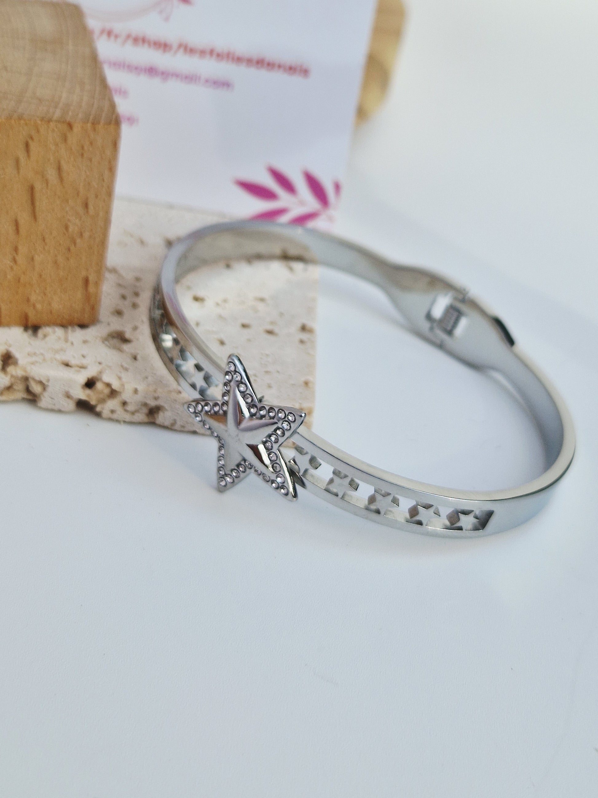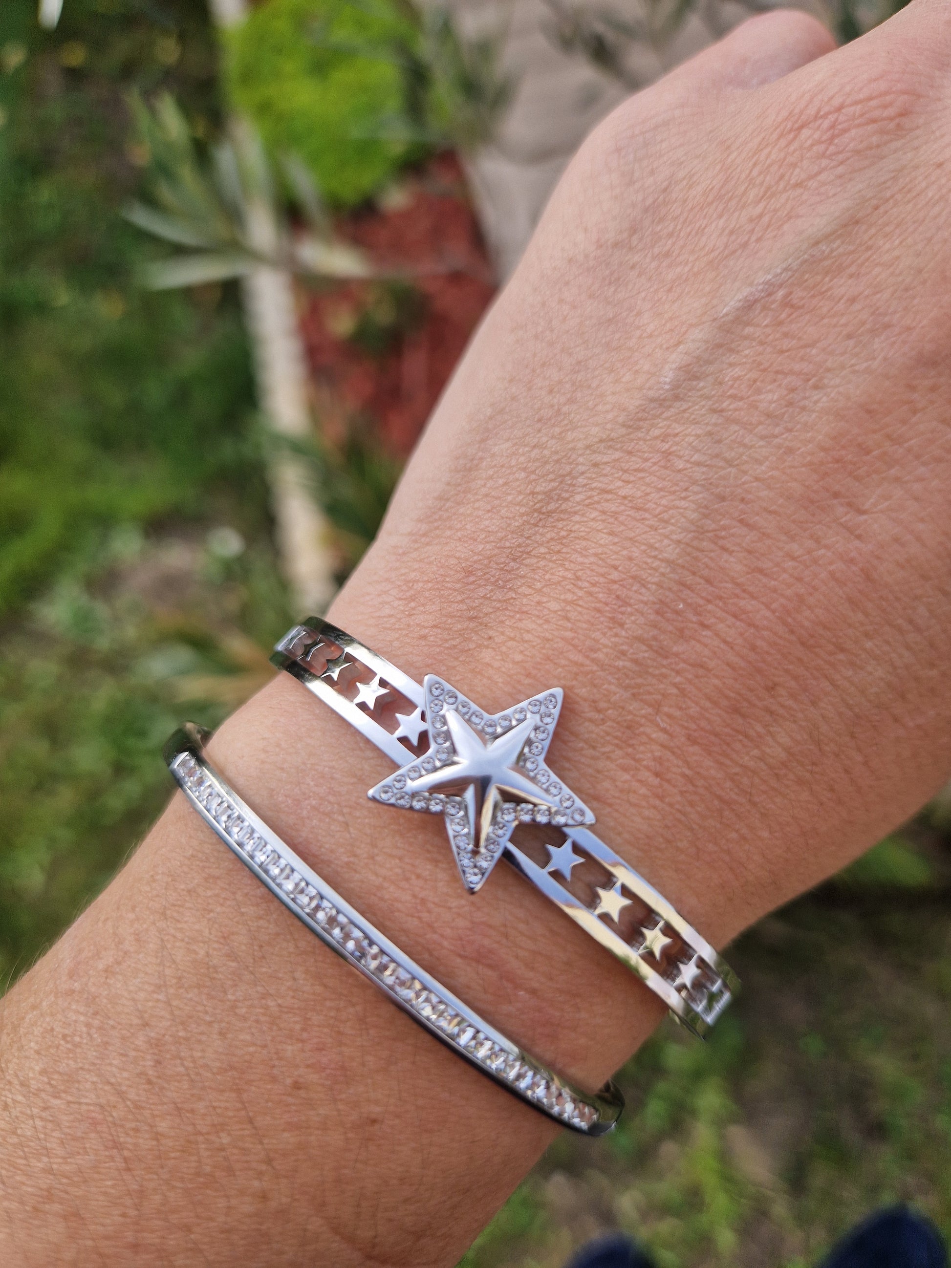 Le bracelet Stella est une véritable déclaration de style : une étoile scintillante mise en valeur par une manchette ajourée d’étoiles en acier inoxydable argenté.